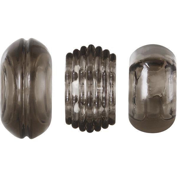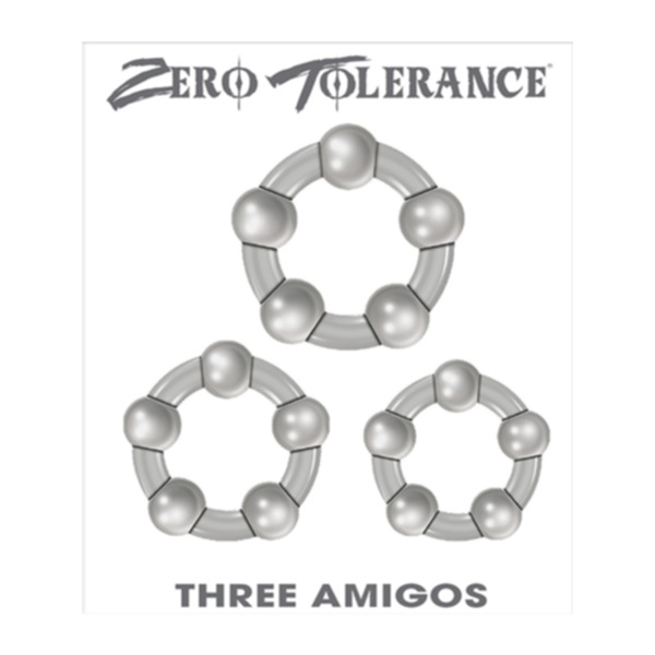 Three Amigos from Zero Tolerance Toys. Three rings in one set means you can experiment finding the perfect fit, or use the size that suits your mood mellow or more sensually daring. Slide the ring to the base of the shaft to experience and let the pleasure beads gently massage for added erotic stimulation. Clean with Zero Tolerance Toy Clean and rinse with warm water. Features 3 beaded cock rings for longer lasting erections. Beads add unique pleasure. Made of stretchy pliable Thermoplastic Elastomers TPE. Chic translucent smoke color. 3 sizes included to suit your play time. Small cock ring 1.23 inches in length by .34 inch in depth by 1.23 inches in width. Medium cock ring 1.33 inches in length by .34 inch in depth by 1.33 inches in width. Large cock ring 1.48 inches in length by .37 inch in depth by 1.48 inches in width. 5 year warranty.