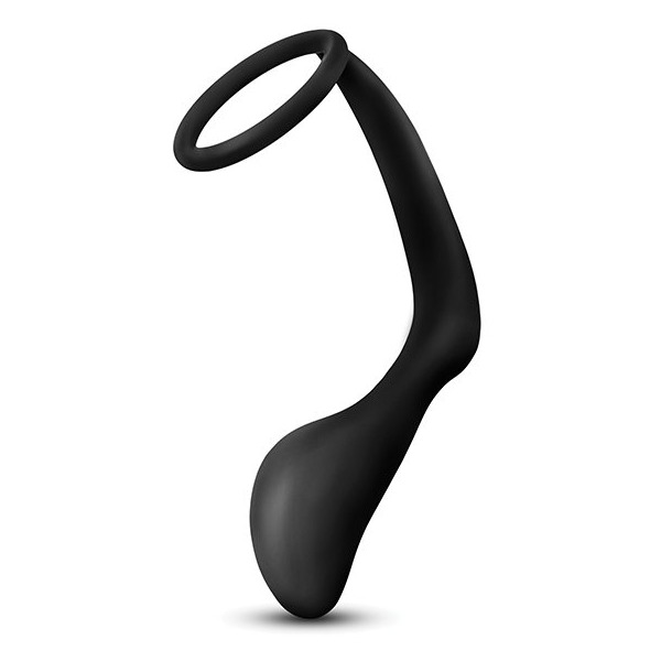 Anal Adventures Platinum Cock Ring Plug Black from Blush Novelties. For anyone looking to explore new anal sensations alone or with a partner! Anal Adventures Platinum provides anatomically targeted options, all made of 100% satin smooth, platinum cured silicone. With each thrust of your hips, the Silicone Cock Ring Plug moves back and forth to massage your prostate. The attached cock ring can be placed around the shaft, balls, or both for lasting performance.