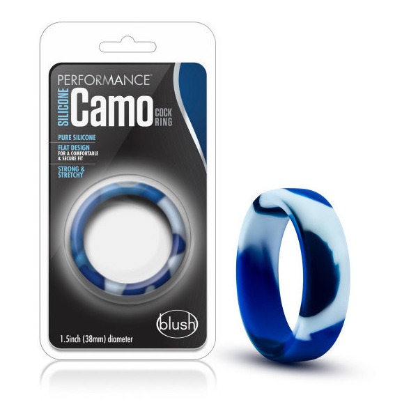 Performance Silicone Camo Cock Ring Blue Camouflage from Blush Novelties. Comfort. Soft and stretchy for greater wear. No slip. Flat design for a secure fit. Quality. Smooth satin Platinum Silicone. Peace of mind. Made of body safe Silicone. Contains no...