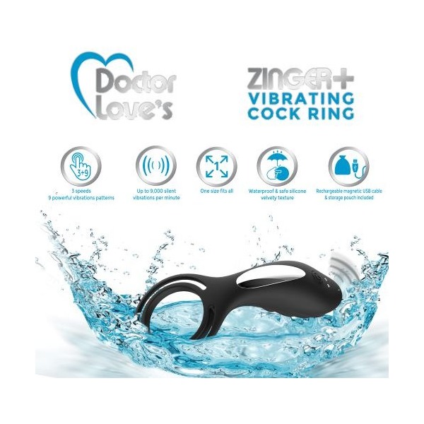 Doctor Love Zinger + Vibrating Rechargeable Cock Ring with Remote Control Black. 3 speeds of powerful vibration patterns. 9 powerful vibrations. Up to 9,000 silent vibrations per minute. One size fits most. Waterproof for play outside the bedroom. Silicone with a velvety texture. Made using body safe, latex free, phthalate free materials Silicone cock ring. Remote control ABS Plastic. Rechargeable via USB. Magnetic charge. Cable included. Includes a storage, travel pouch.