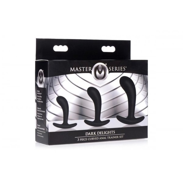 Master Series Dark Delights 3 Piece Curved Silicone Anal Trainer Set from XR Brands. Curve into your backdoor with this delightful 3 piece of anal pleasure. This trainer set includes 3 different sized plugs for backdoor beginners and veterans alike to enjoy warm up with the smallest plug and train your way to the biggest when you feel youre ready. Made with premium silky smooth silicone that is phthalate and body safe so you can train your holes with no worries. The velvety exterior is a dream to squeeze your holes on, and is perfect for entry level anal players exploring new ways to play. The slight curve is designed to pinpoint your favorite spots so you can easily stimulate during play, Use these with your partner to practice clear communication and explore your anal desires! The ergonomic base neck is slim and comfortable so you can hit your deepest spots without irritating the entrance of your hole. Compatible with water based lubricants only. Avoid use with silicone or oil based lubes to prolong the life of this trainer set. Color Black. Materials Phthalate free silicone. Care instructions: clean and sanitize before and after use with warm water and mild soap or toy cleaner. Avoid use with silicone or oil based lubricants, these plugs are compatible with water based lube only. Small plug measurements overall length 3.1 inches, insertable length 3 inches, widest diameter 0.8 inch. Medium plug measurements overall length 3.7 inches, insertable length 3.4 inches, widest diameter 1.1 inches. Large plug measurements overall length 5 inches, insertable length 4.5 inches, widest diameter 1.45 inches.