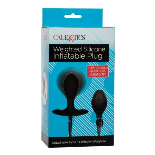Weighted Silicone Inflatable Butt Plug from California Exotic Novelties. The Cal Exotics Weighted Silicone Inflatable Plug is a one of a kind anal probe with inflatable weighted body, easy squeeze bulb and detachable hose. For increased pleasure, this probe is perfectly weighted with a 1.2 ounces ball. To inflate your ecstasy, simply attach the hose and press the easy squeeze bulb. Once you have reached the desired size, the probe will hold its size even when the hose is removed. A quick air release button allows for gentle deflation and removal. To enjoy the exhilarating world of anal pleasure to the fullest, sensual stimulation is the key to success. The tapered silicone probe has the perfect amount of flex to bend and move naturally with your body. The durable flanged base is perfect for insertion, stimulation and removal. The flexible probe, hose and bulb are made from a seamless silicone with ABS plastic release valves. The silicone plug has an overall size of 3 inches by 1.25 inches before inflation. More information: ColorBlack. Materials Silicone, ABS Plastic. Features Phthalate free. 1 year warranty from California Exotic Novelties. Measurements 3 inches by 1.25 inches before inflation. Bulk weight4.5 ounces. Package 5.8 ounces. Package 8.25 inches by 4 inches by 2.75 inches.