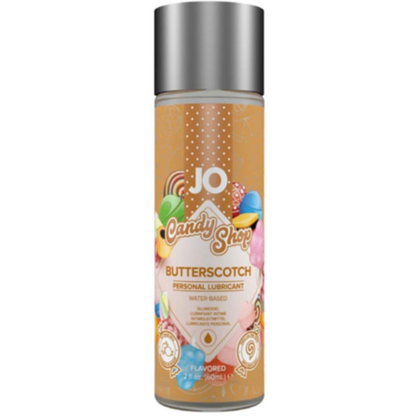 System JO Candy Shop Butterscotch 2 fluid ounces. The New JO H2O Candy Shop Flavored offers a range of new flavors that will bring back all of your fondest memories of those devilishly sweet desserts, while also enhancing foreplay and intimacy. Formulated with a pure plant based glycerin and infused with natural flavor extracts, this collection will encourage your more playful side, while simultaneously enticing your all too important naughty side! No added sugar or artificial sweeteners also make this a guilt free addition that will bring the Candy Shop to any bedroom.