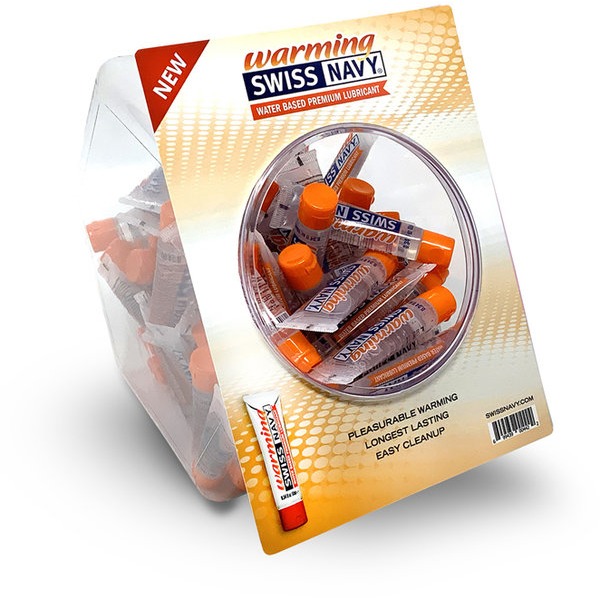 Swiss Navy Warming Lubricants 10ml 100 Count Fishbowl from MD Science Labs. Warming Lubes Introducing Swiss Navy Warming. Pleasurable warming. Feels and lasts like silicone. Recommended for pleasurable arousal. Ingredients: Deionized Water, Glycerin, Propylene Glycol, Cellulose Gum, Potassium Sorbate, Sodium Benzoate, Vanillyl Butyl Ether, Diazolidinyl Urea, Acesulfame Potassium. Directions: apply as desired to area to be lubricated. Water based warming formula that is recommended for pleasurable arousal. Made in the USA. Directions apply as desired to area to be lubricated. If irritation occurs, discontinue use immediately. Do not use if outer seal is broken or missing. Keep out of reach of children. Ingredients: Deionized Water, Glycerin, Propylene Glycol, Cellulose Gum, Diazolidinyl Urea, Sodium Benzoate, Potassium Sorbate, Potassium Acesulfame, Triethanolamine Citric Acid. Each item is 10ml e or approximately .33 fluid ounce. Fishbowl display with 100 count .33 fluid ounce.