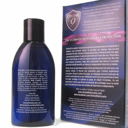 Doctor tested. Doctor recommended. Divine 9 Water Based Lubricant 4 ounces. The ultimate in pleasure and protection. Divine 9 is a water based personal lubricant perfectly formulated for a slippery yet intimate touch. It provides an intense skin on skin...
