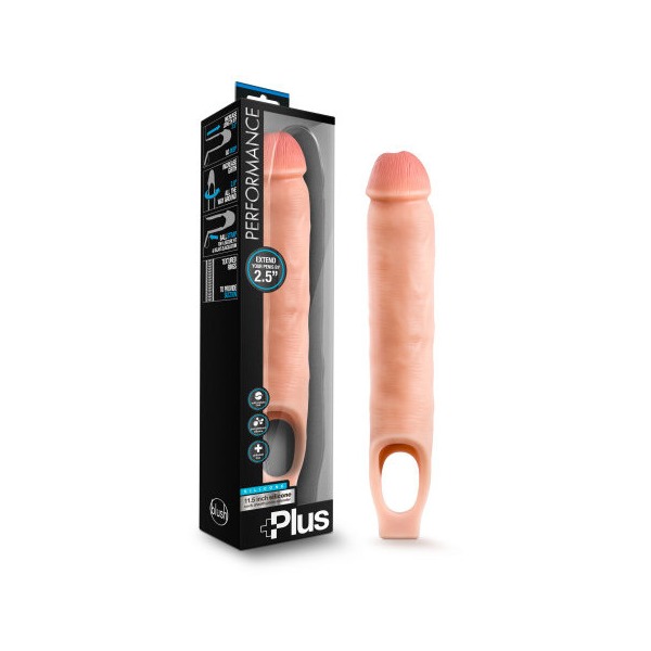 Performance Plus 11.5 Inches Silicone Cock Sheath Penis Extender Beige from Blush Novelties. Amplify with extra girth and length are yours. Sensation for both partners by internal ribbing creates suction and more sensation for the wearer. Stays on - ball strap secures around ball sack. Peace of mind - made of Platinum Cured Silicone. Contains no fragrances, phthalates or latex. Size - 11.5 inches in total length, 8.75 inches insertable length by 2 inches in width. The Performance Plus 11.5 Inches Cock Sheath Penis Extender offers a smooth, realistic feel while maximizing your potential. Gain more girth and 2.5 inches extra length! The internal ribbing creates suction that holds the sheath securely in place. It also amplifies sensation for the wearer. Just insert your penis into the Performance Plus 11.5 Inches Sheath and then slide your testicles through the ball strap. Then explore new dimensions with your partner! Made of platinum cured silicone, the Performance Plus 11.5 Inches Cock Sheath is durable, body safe, and easy to keep clean.