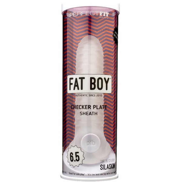 Perfect Fit Fat Boy Checker Box Sheath 6.5 inches Clear from Perfect Fit Brand. Like our original Fat Boy cock sheath, but with a new textured surface. Adds noticeable girth to your cock without being too much for your partner to handle. Made of super soft and stretchy SilaSkin, it is designed to give both partners intense, eye rolling pleasure. The Fat Boy was the first soft stretchy sheath ever conceived. It was born from the desire to have both partners reach orgasm while using an Extender. This innovation started an extender revolution, and this new concept Sheaths to be recognized as one of the best sex toys made. Mens Health named it one of the best sex toys of 2017! What made this possible, was the development of a remarkably soft, silky and stretchy material we call SilaSkin. The first TPR/Silicone to ever be used in production, the material has become a building block for many other award winning products by Perfect Fit. Ultra real feeling, cock sheaths are designed to give both partners intense, eye rolling pleasure. For the receiving partner, the Fat Boy adds girth, while for the wearer, with its interior nubs and ribs, it also acts as a stroker. The Fat Boy is extremely comfortable, easy to get on and off and stays in place thanks to its closed tip and a thick loop that wraps around the base of the scrotum, which gives a pleasurable tug to a mans balls during penetration or stroking. Fat Boy Checker Box Sheath 6.5 inches clean up: wash thoroughly with mild soap and water. Safety: this product is not a contraceptive or a substitute for a condom. Safe with water based lubes. This product is not compatible with latex products. Please store separately. Perfect Fit Brand Products are sold and intended for use strictly as adult novelty toys for entertainment. They are not intended for medical use and have not been clinically tested. No medical claims are warranted or implied by the use of these products. These products are phthalate free, do not contain latex, and meet European EN71-3 toy safety standards.
