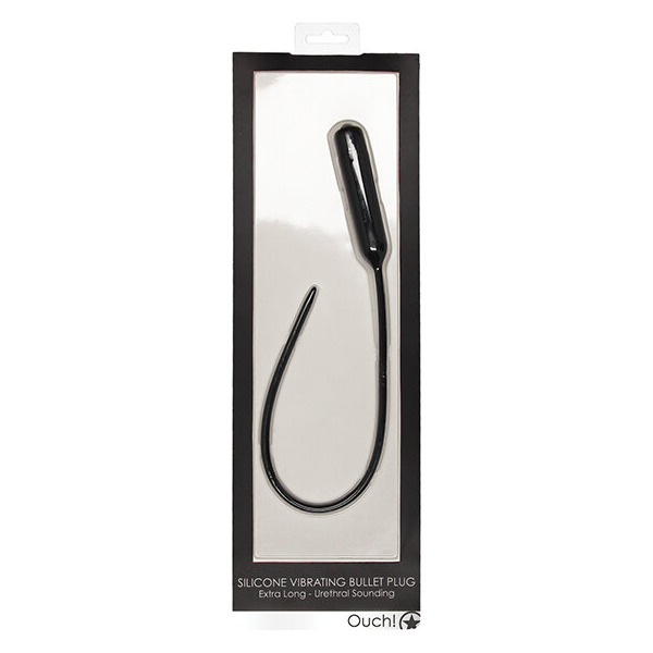 Ouch Silicone Vibrating Bullet Plug Extra Long Urethal Sounding Black from Shots Toys. Ouch! Introduces a new line of toys for urethral explorers! If urethral sounding is your kink, then let these smooth probes deliver the ultimate pleasure! The urethra is lined with super sensitive nerve endings, which can be extremely pleasurable when stimulated. Additionally, deep urethral play is the only way to directly massage the prostate. Ouch! Has a variety of urethral sounding probes for beginners as well as advanced users! This super long vibrating model is very flexible and the rounded tip allows easy insertion. The probe has a single vibration mode going up to a staggering 12,000 rpm but is ultra quiet at less than 50dB. It takes one AAA battery, included. Made from super smooth medical grade, phthalate free silicone, the toy has a total length of 17.7 inches, an insertable length of 13.41 inches and a diameter of 0.2 inch.
